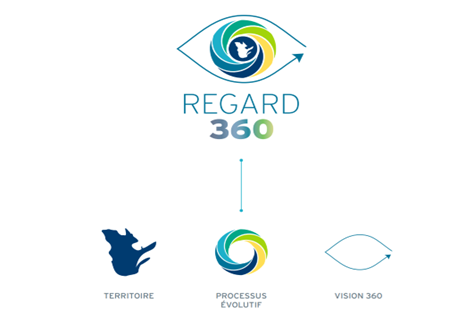 Le logo du projet Regard 360 a été développé par une firme de design graphique, avec l’équipe de recherche, dans le cadre d’un processus itératif et collaboratif, afin de refléter la philosophie et les objectifs du projet. La signification de chaque partie du logo est décrite ci-dessous.